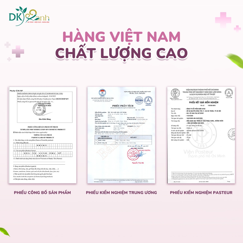Gel vệ sinh phụ nữ Oriky được sản xuất trên dây chuyền đạt chuẩn ISO 9001:2015, với quy trình kiểm soát nghiêm ngặt từ nguyên liệu đến thành phẩm. Sản phẩm có đầy đủ hồ sơ pháp lý, phiếu công bố và kiểm nghiệm tại các đơn vị uy tín, đảm bảo an toàn cho người sử dụng.