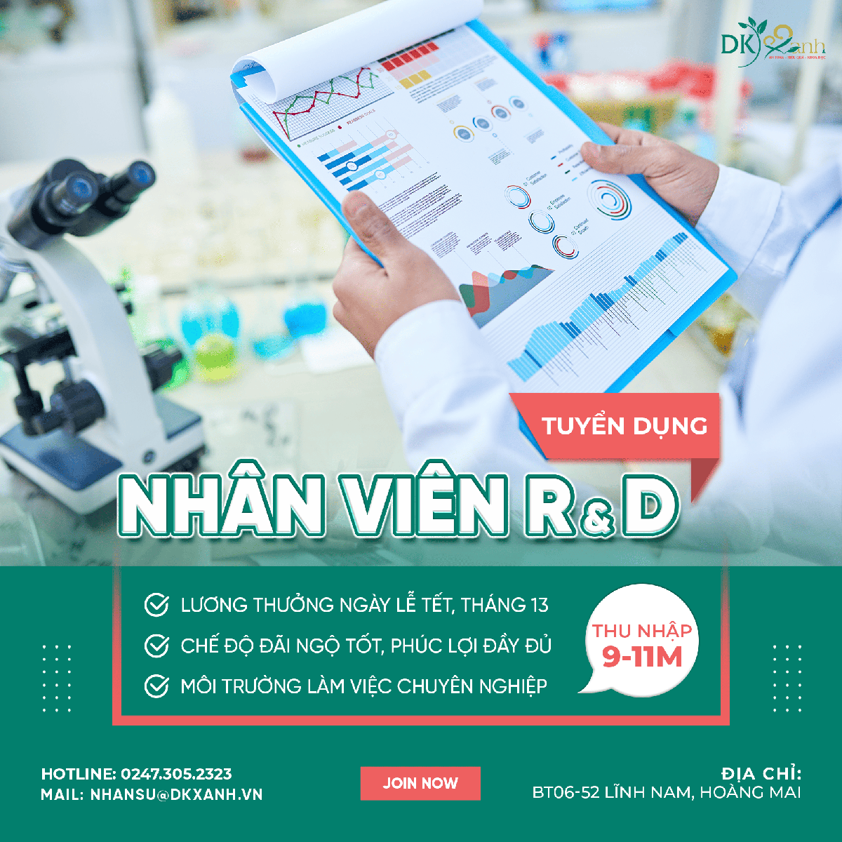 - Cách 1: Liên hệ: 0247.305.2323 – Phòng Nhân sự hoặc gửi CV về địa chỉ email: nhansu@dkxanh.vn